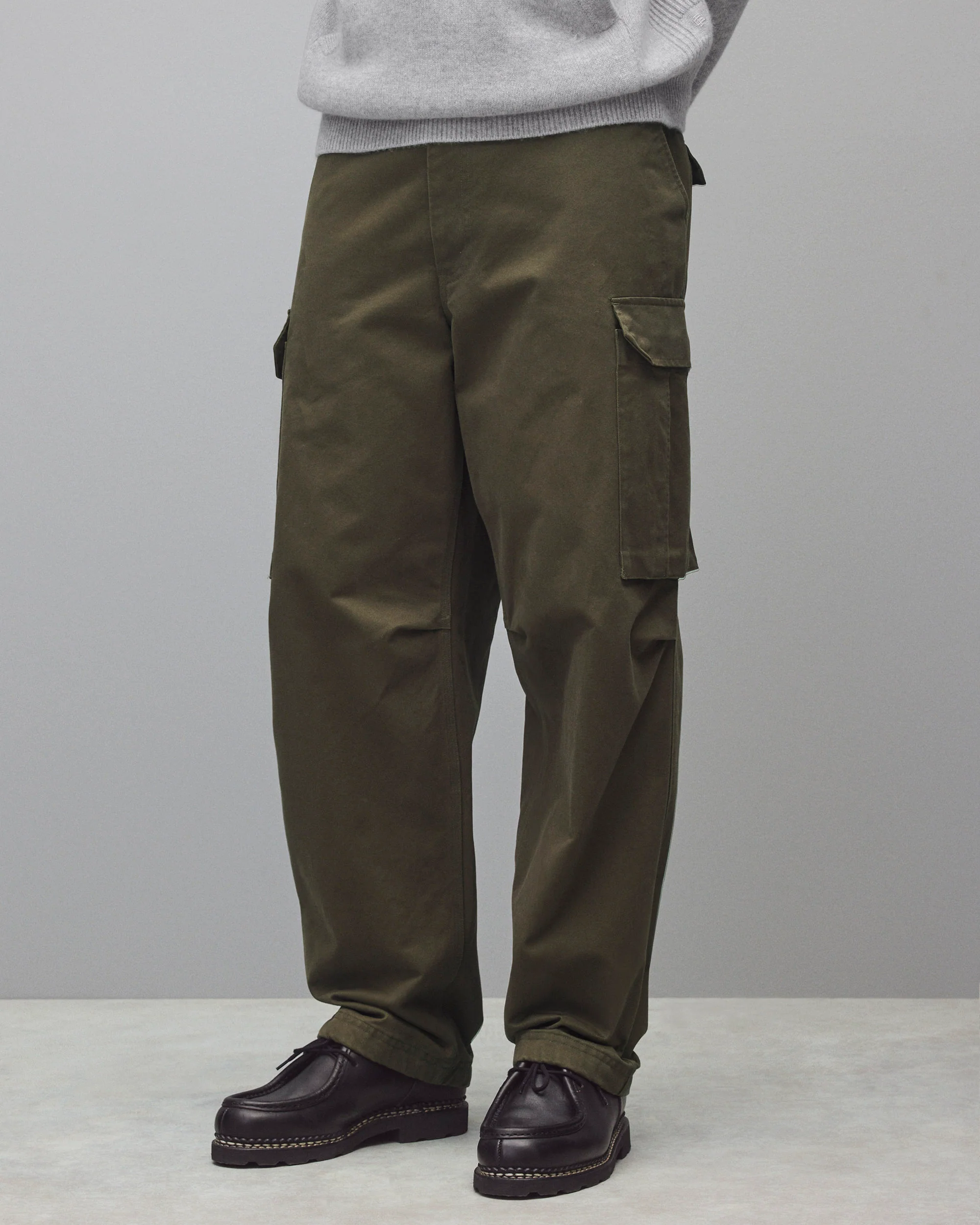 This classic cargo pant is crafted from a cotton chino twill that's washed for a softer, lived-in feel. Featuring a generous straight leg, with a regular rise. Designed with a belt loop waistband, corded slash pockets, a YKK metal zip fly, bellowed cargo pockets, rear flap pockets, and drawcord cuffs. Finished with knee pleats for added volume and ease of movement.